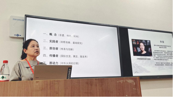 《非遗的传承与创新》讲座主要分为五部分内容:一,非遗、传统与时尚概念与内涵解析;二,实践者(田野考察、基础研究);三,原创者(传承与创新);四,传播者(国际交流、展览、服装秀);五,原动力(中外大师的引领)。李薇教授从非遗、传统与时尚的关系,结合自身田野考察和基础研究的案例,对中国传统元素的传承现状、传承要素提出了真知灼见,李教授用丰富的案例分析结合自身实践,通过分享原创设计作品《夜与昼》(获“第十届全国美术作品展”金奖)、《清、远、静》(获“从洛桑到北京”第六届国际纤维艺术双年展金奖)等作品,对理解中国元素的服装设计、本人获奖作品的设计理念、中西方的服装造型在形态上的区别、艺术与实用的关系和区别娓娓道来,让同学了解到服饰文化的深刻内涵。