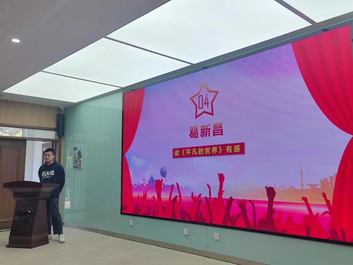 葛新昌同学和丰浩同学向大家分享了“最喜欢的一本书”——《平凡的世界》。这本书教会了我们很多人生的哲理。生活不能被动地等待命运的安排,而应自己去争取,不论结果是喜是悲,我们都须尽力一试,即使没有达到预想的效果,但也一定会有所收获。平凡,也许见证的是奋斗。生活不能等别人来安排,要靠自己去争取、去奋斗!作为新时代的大学生,我们应该在平凡的生活中找寻前进的方向,不忘初心,在平凡中创造伟大。
