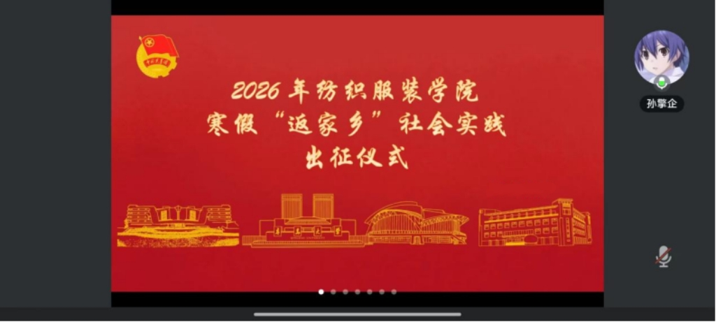 近日,我院寒假“返家乡”社会实践出征仪式在线上圆满举行。本次活动以“扎根家乡、服务基层、安全实践、锤炼成长”为宗旨,旨在引导纺院学子将青春热血融入家乡发展,以专业所长回应社会需求,在实践历练中厚植家国情怀、锤炼综合素养。学院师生代表云端齐聚,为即将踏上实践征程的学子们壮行鼓劲,明确实践方向,筑牢安全防线。