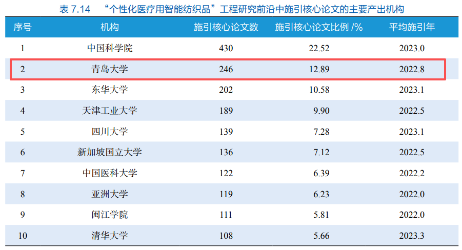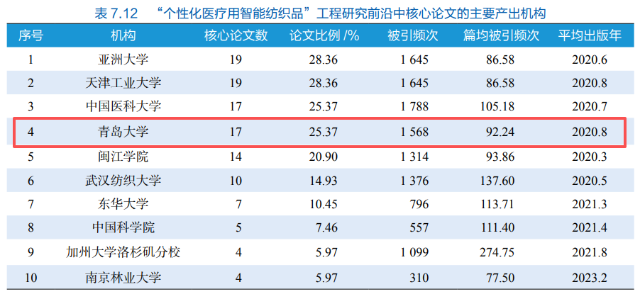 成功入选“个性化医疗用智能纺织品”工程研究前沿中施引核心论文的主要产出机构榜单,位列全球第2;成功入选核心论文的主要产出机构榜单,位列全球第4。