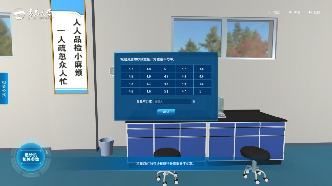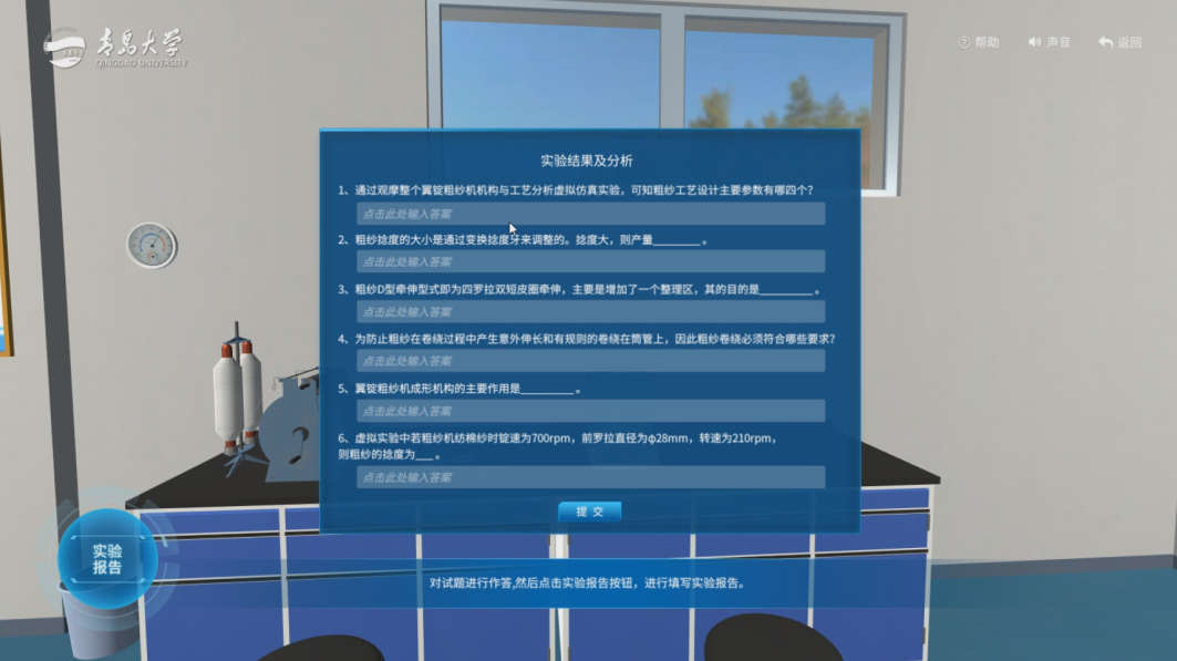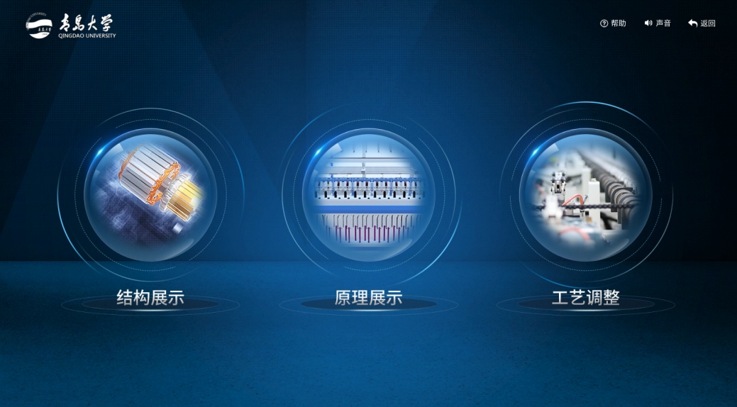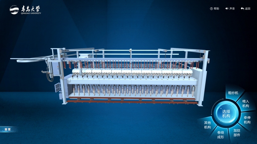 山东省纺织服装实验示范中心开发了翼锭粗纱机机构与工艺分析虚拟仿真实验”,面向纺织工程专业本科生、高职高专学生及企业工程技术人员开放,该试验平台以目前最先进的FA系列翼锭粗纱机为基础支撑,通过三维扫描、图形处理、模型生成、多媒体及丰富色彩和活跃的音乐等虚拟现实技术,形象地再现翼锭粗纱机内部结构、工作原理及各部件之间的运动配合情况,实现粗纱工艺流程、机构与工艺分析及其产品性能的展示。还通过在线交互式操作、任意工艺参数设计调整、工艺上机试纺、设计纺制粗纱半制品,并优化处理实验数据、撰写提交实验报告,完成综合设计性实验。