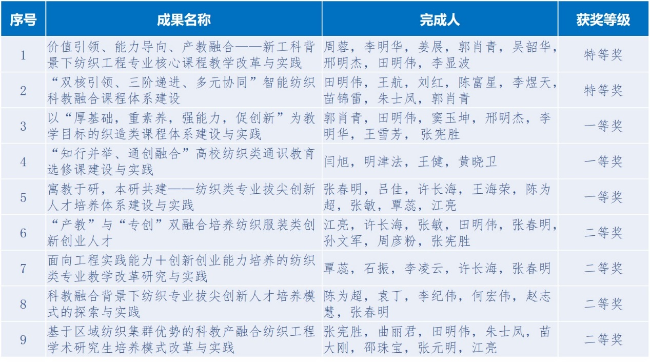 据悉,“纺织之光”中国纺织工业联合会纺织高等教育教学成果奖每两年评选一次,主要奖励在人才培养模式、教学改革、课程建设等方面具有原创性、示范性的教育教学成果,促进纺织行业教育的发展,本届共评选出特等奖68项、一等奖153项、二等奖502项。