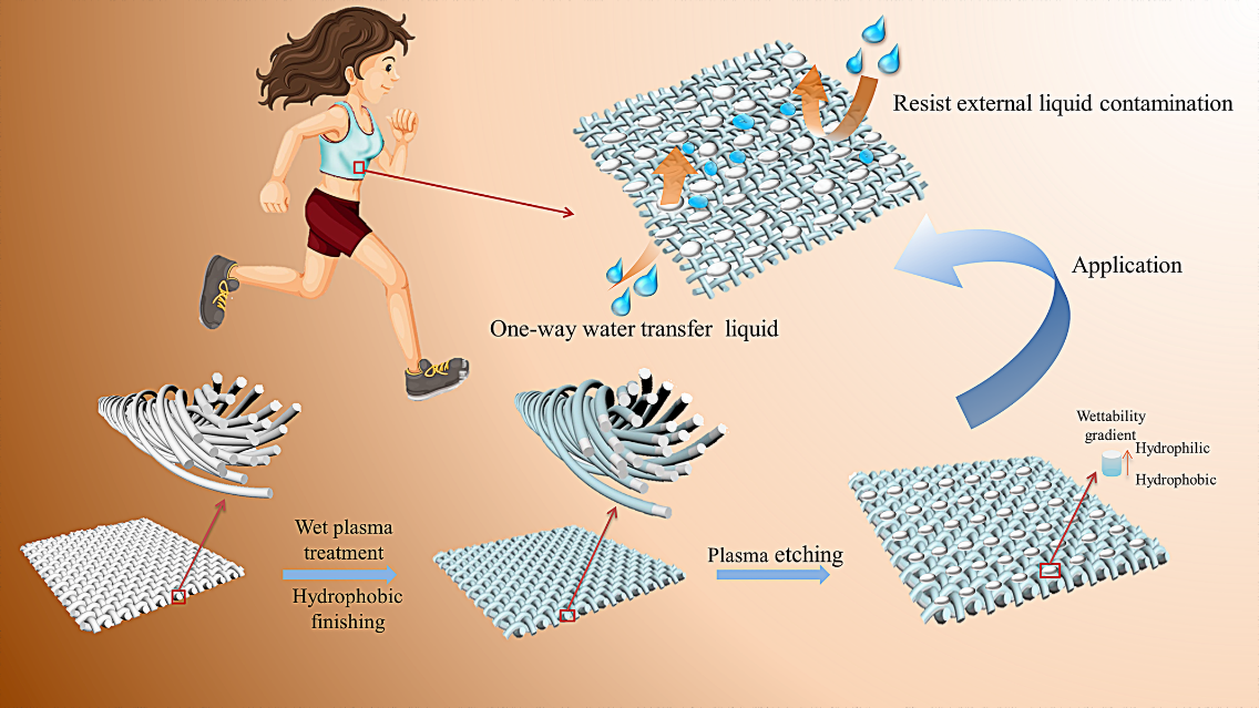 论文“Fabrication of a wearable directional moisture-transfer cotton by clean technology of wet plasma, without fluoride consumption”(//doi.org/10.1016/j.indcrop.2021.113995)提出一种制备单向导湿且能抵抗外部液体污染物的可穿戴棉织物的绿色环保方法,采用湿等离子体结合无氟疏水剂来制备疏水织物,再利用等离子体对疏水织物进行单侧有选择性刻蚀制备出单向导湿织物。结果表明,湿等离子体不仅可以减少25%的疏水剂消耗,并显著提高了织物的疏水性和耐水洗性,单向导湿织物可以克服液滴自身重力在3秒内完成水分传递的同时还不会反向渗透织物。以上两项研究均得到国家重点研发计划课题(No.2017YFB0309704)和中国博士后科学基金项目(No. 2018M632624)的资助。