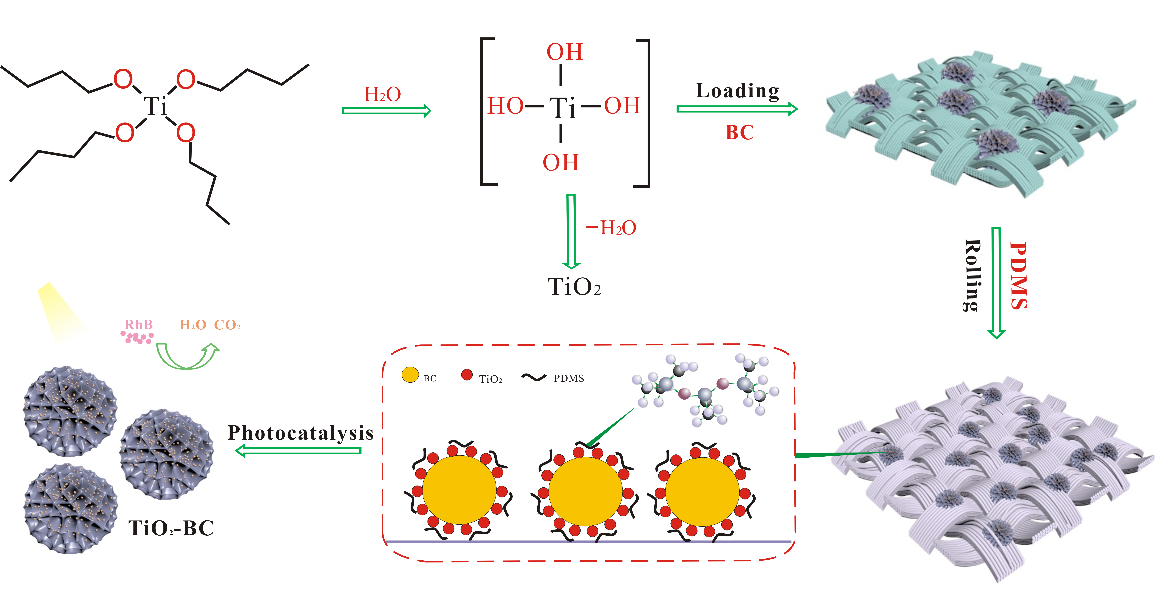 论文“Durable superhydrophobic and photocatalytic cotton modified by PDMS with TiO2 supported bamboo charcoal nanocomposites”(//doi.org/10.1016/j.indcrop.2021.113896)采用表面多凹陷复合材料结合有机硅物料结合竹炭粉的天然粗糙结构制备出一种光催化超疏水多功能纯棉服装材料,并在达到预期效果的基础上降低了生产成本。分析结果表明,整理后的棉织物达到超疏水效果,对罗丹明b的催化降解率达87%以上,使织物同时具有疏水及降解有机物的功能,且具有一定的耐热性、抗污性及自清洁性。