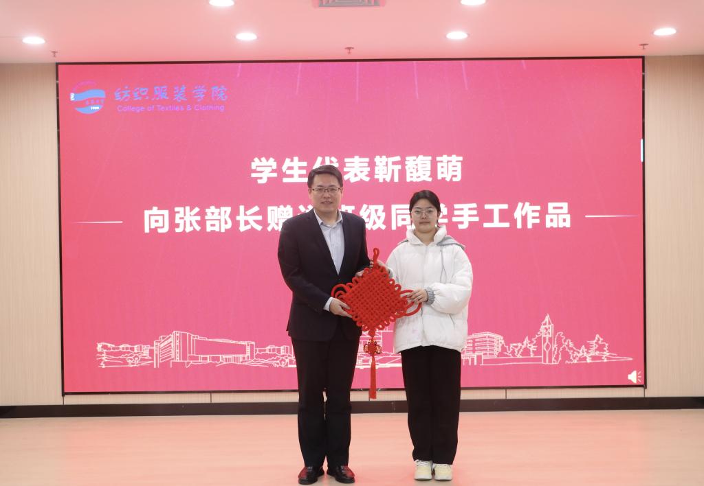 靳馥萌向张守珩赠送全班同学共同制作的中国结